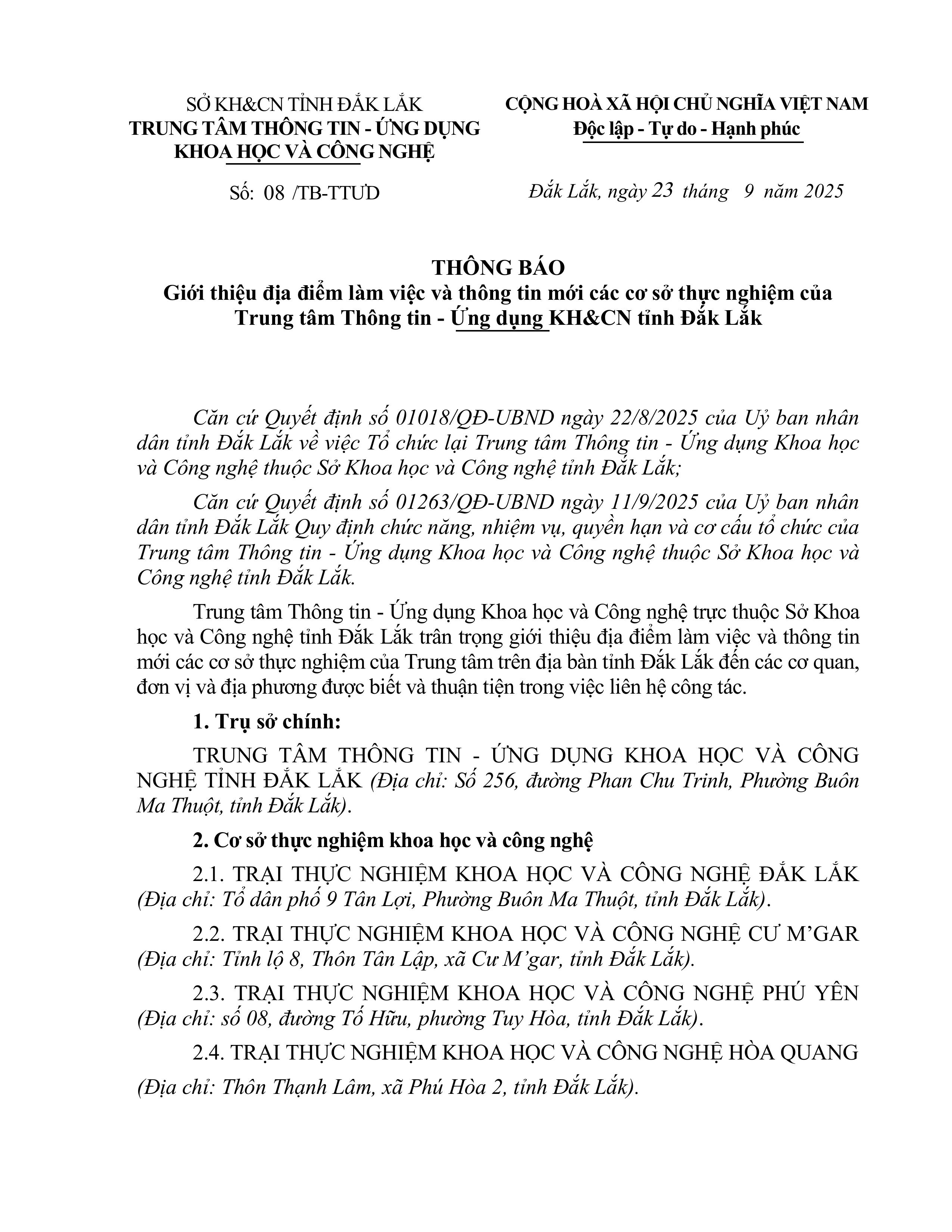 - THÔNG BÁO Giới thiệu địa điểm làm việc và thông tin mới các cơ sở thực nghiệm của Trung tâm Thông tin - Ứng dụng KH&CN tỉnh Đắk Lắk (24/09/2025, 00:00)