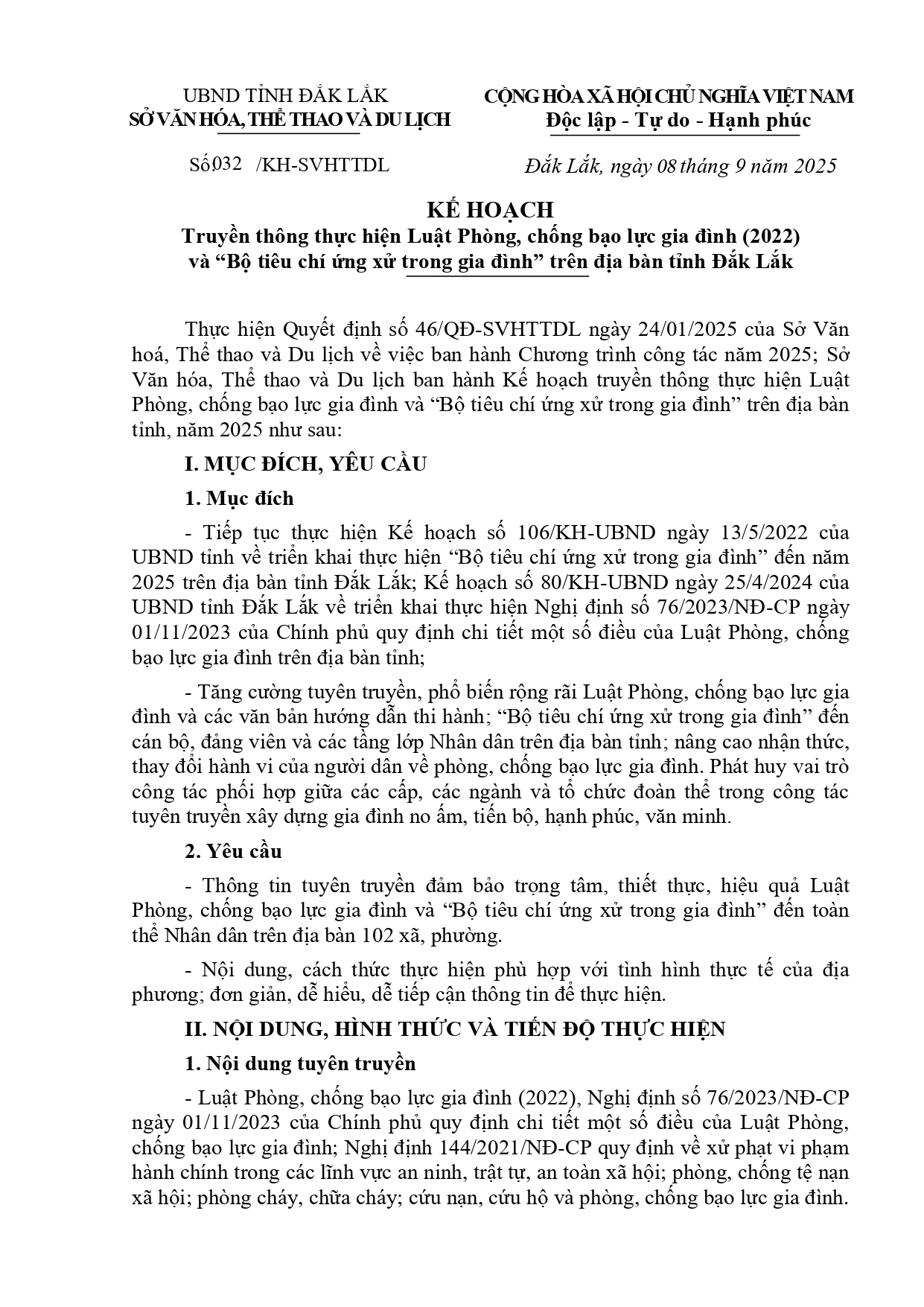 - KẾ HOẠCH Truyền thông thực hiện Luật Phòng, chống bạo lực gia đình (2022) và “Bộ tiêu chí ứng xử trong gia đình” trên địa bàn tỉnh Đắk Lắk (22/09/2025, 00:00)