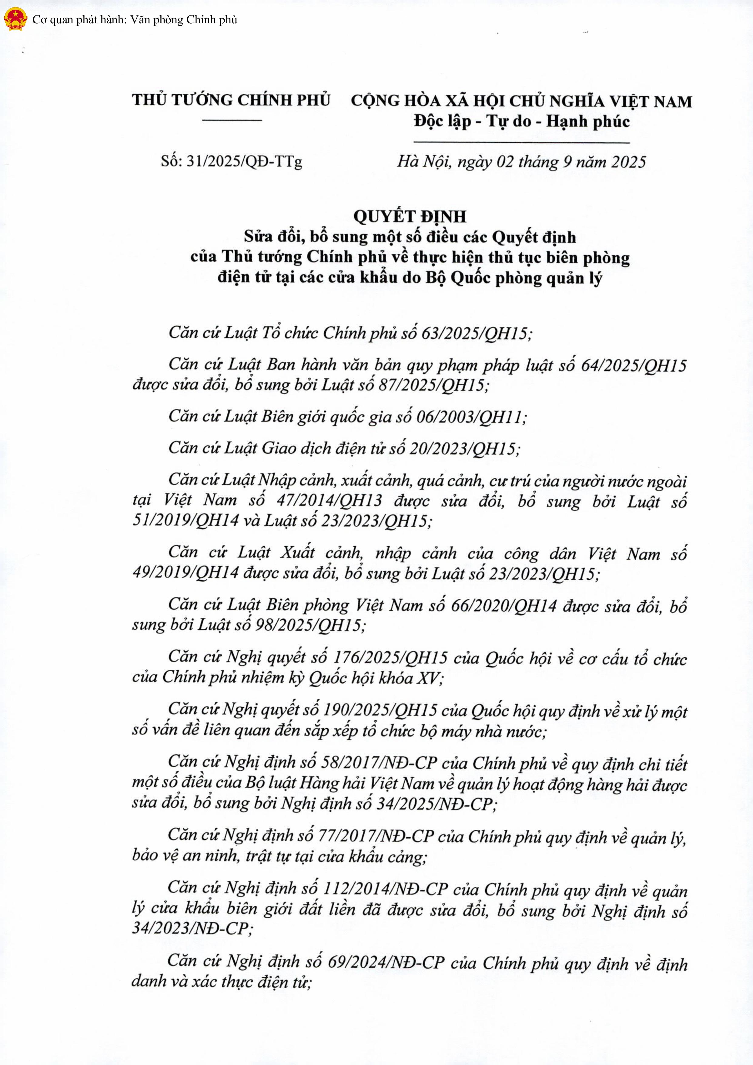 - Quyết định số 31/2025/QĐ-TTg ngày 02/9/2025 của Thủ tướng Chính phủ về việc sửa đổi, bổ sung một số điều các Quyết định của Thủ tướng Chính phủ về thực hiện thủ tục biên phòng điện tử tại các cửa khẩu do Bộ Quốc phòng quản lý